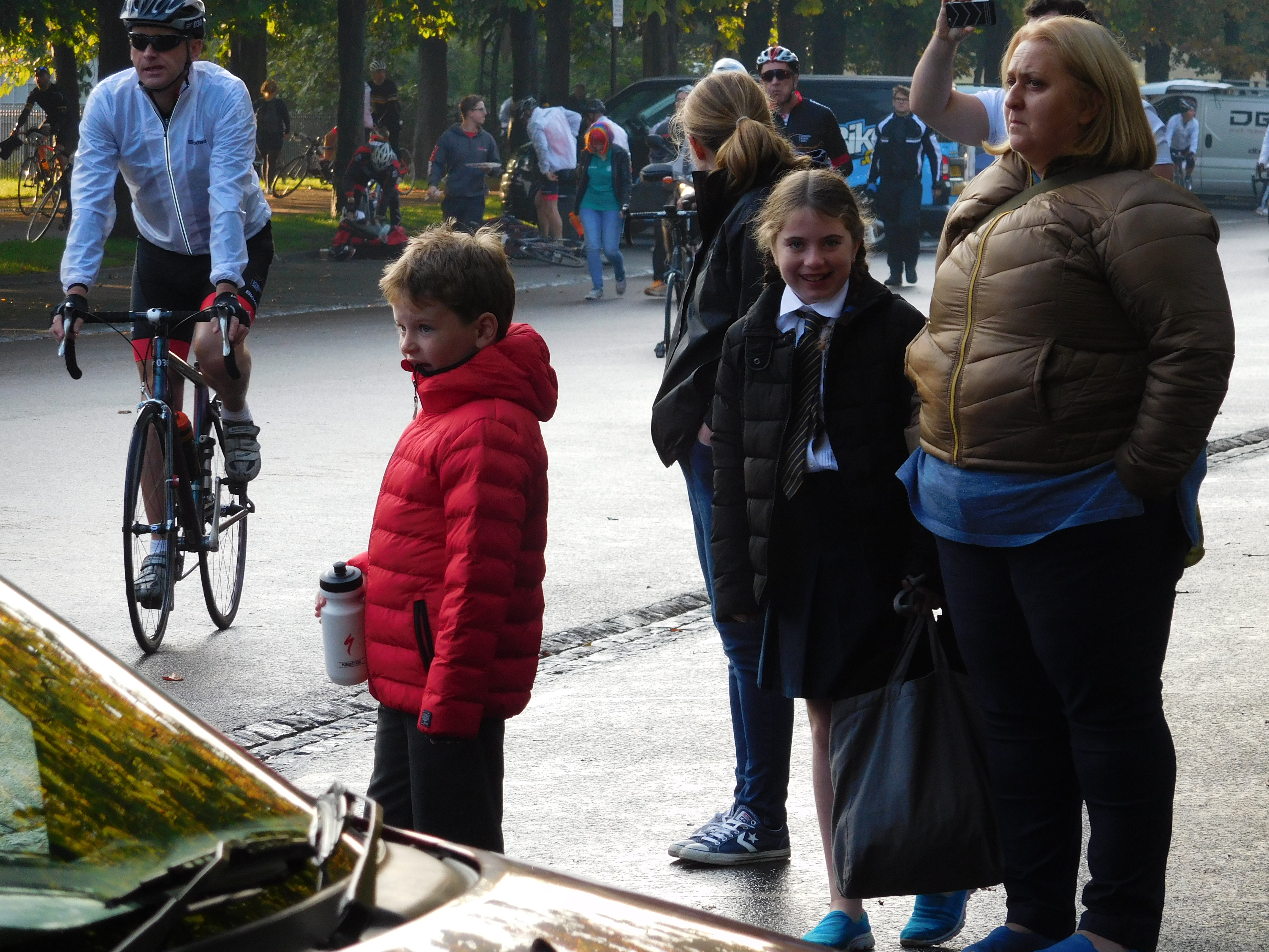 All five ‘gurneurs’ piled into Maureen’s car – bikes, cases, school ties and all – incredibly early in the morning to drive us (Iain and Jackie) to the start at Greenwich Park. Molly and Patrick had been determined to come along even although it was a school day.