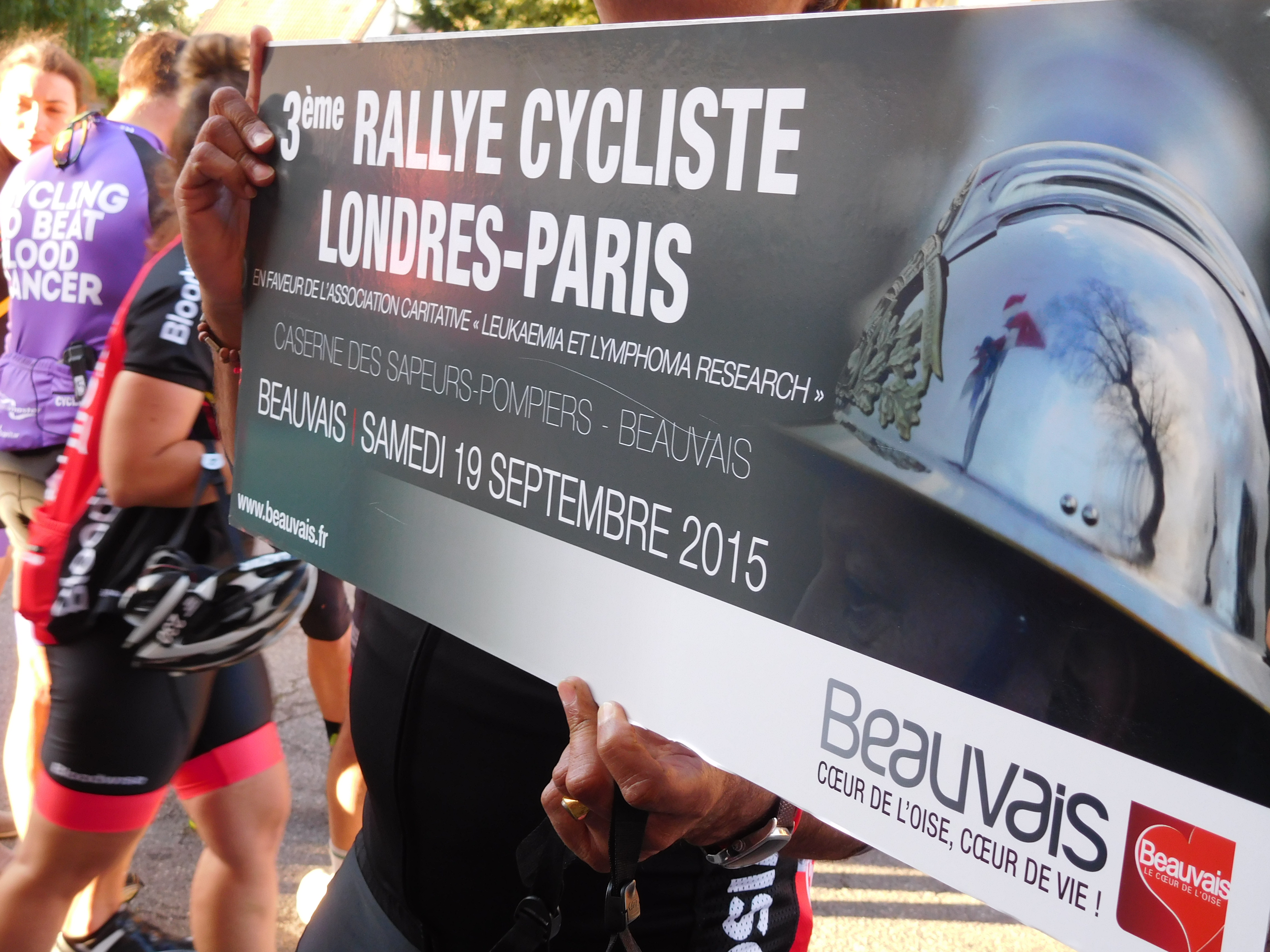 Beauvais, our Day Three destination was as quirky and charming as last year. Quirky, because the venue again was the Sapeur-Pompiers centre – our bikes were spending the night amongst the town’s fire engines. Charming, because again the deputy mayor made a formal presentation thanking Bloodwise for fighting blood cancer. This was accompanied by wine and drinks, proffered by waiters and waitresses, lined up beside the stark concrete hangar. The warm welcome extended to us here should have been no surprise, we’d just cycled up Avenue Winston Churchill to reach the main centre of the fire station.