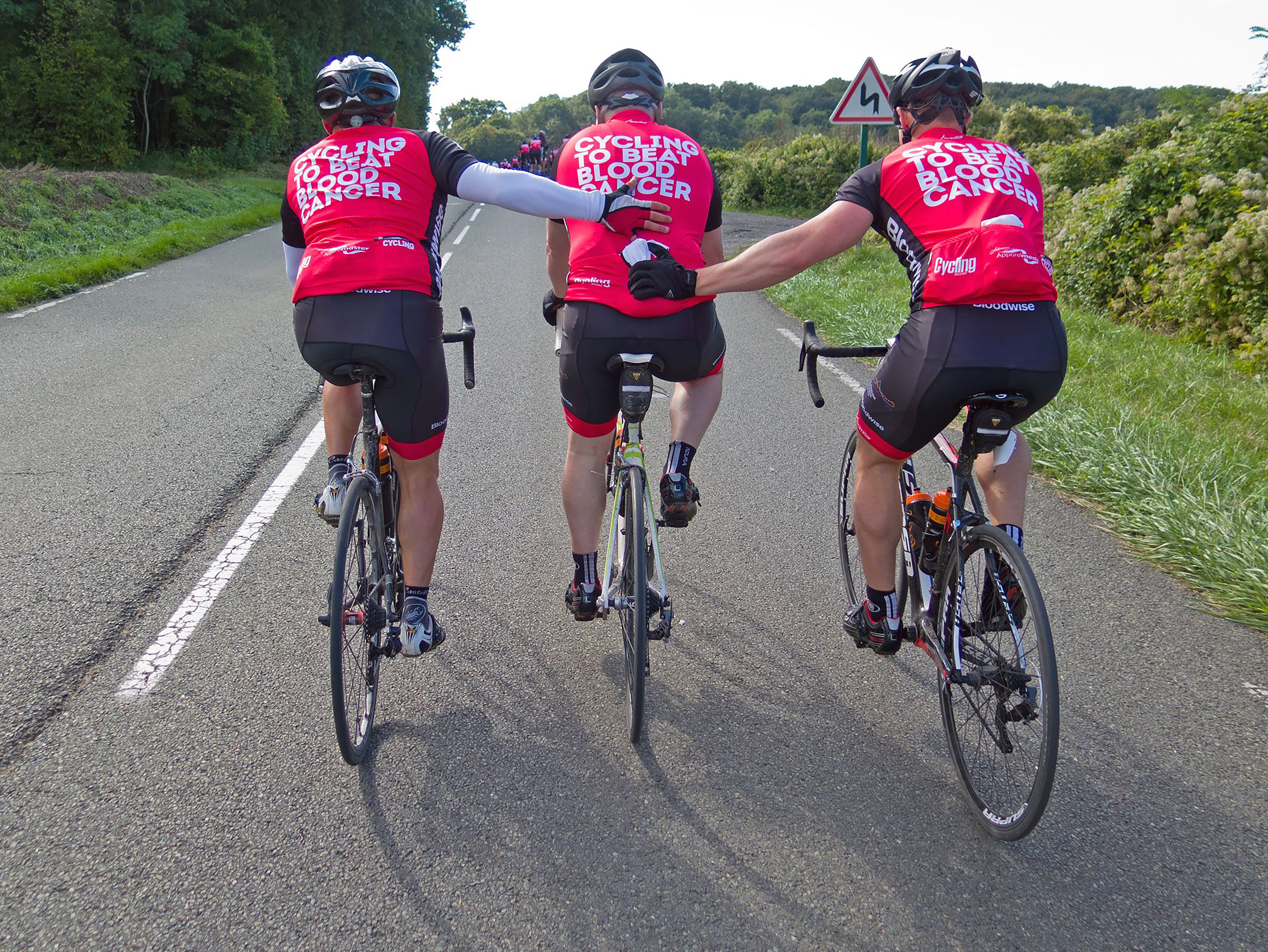 Out third day on the road was less hilly. It stayed dry and we did manage to appreciate our surroundings. Lots of friendly and curious locals, barking dogs and diffident drivers. A man caught on the pavement in front of his house in his dressing gown did not appear to be phased by a Bloodwise peleton of riders rushing past. An elderly lady clutching fresh baguettes also gazed on appreciatively as we whooshed by.